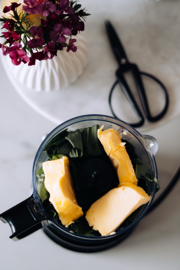 Die weiche Butter mit dem klein geschnittenen, frischen Bärlauch in den Mixer geben. Salz, Pfeffer & Zitronensaft draufgeben & direkt vermischen.